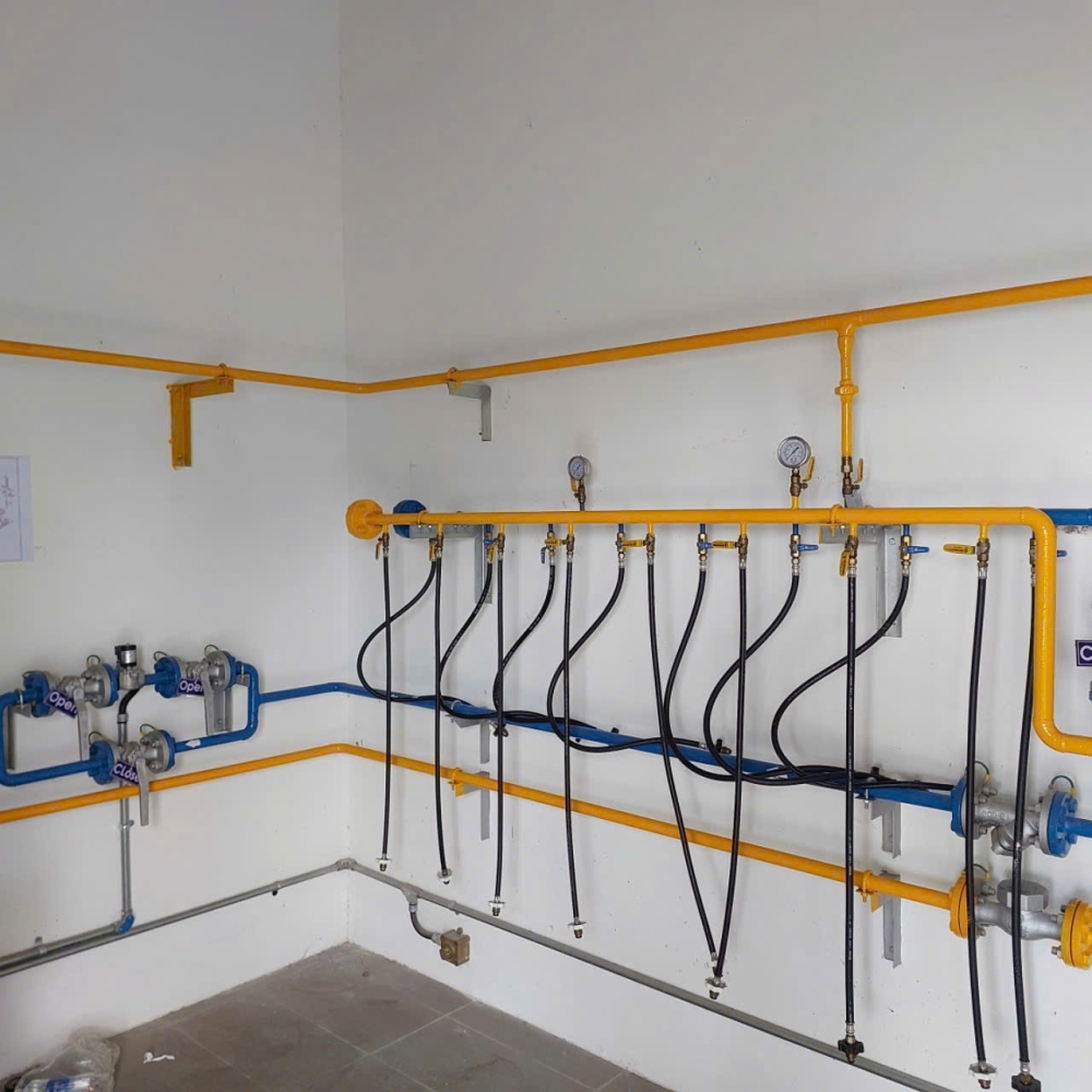 Lắp đặt bộ điều áp, van khóa tự động, cảm biến rò rỉ gas, tủ điều khiển trung tâm.